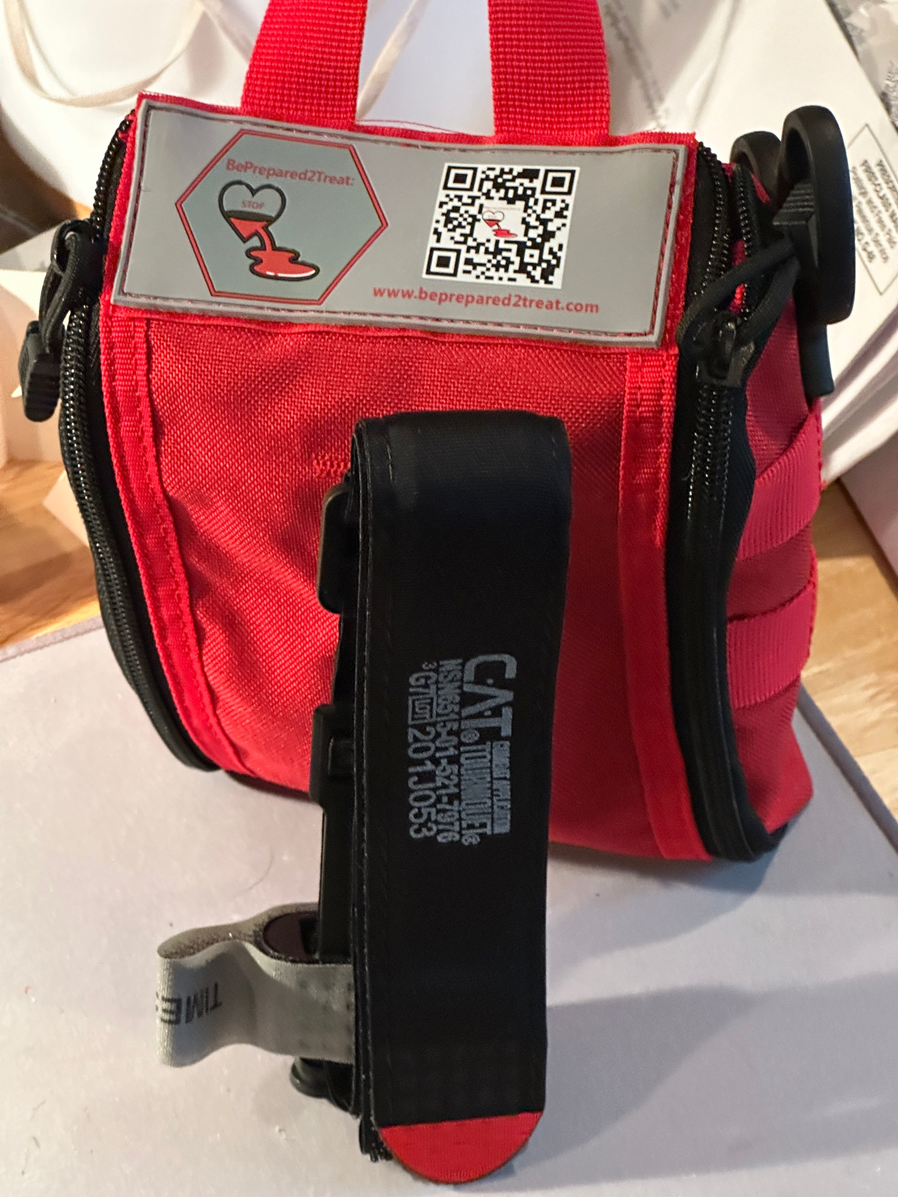 The sturdy, red bag by BePrepared2Treat features a handle, tear-away panel, and removable tourniquet pouch for quick access.