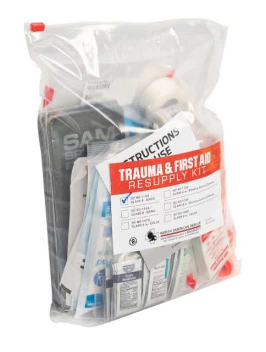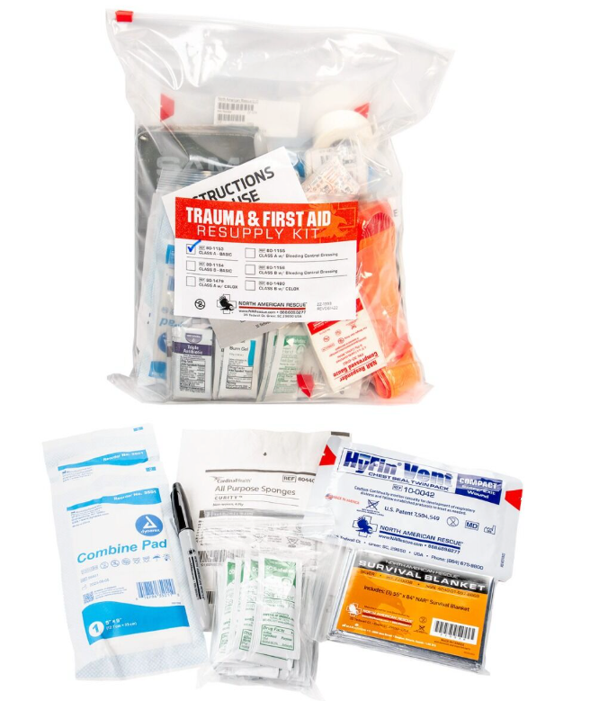 The Class A Trauma & First Aid Resupply Kit from North American Rescue are designed to refill our portable First Aid Kits for the workplace. Our kits not only meet the ANSI/ISEA Z308.1-2021 Standard for Class A kits but also exceed the standard by adding additional bleeding control elements. This kit offers the ability to treat the most common workplace injuries with the added benefit of being able to control major bleeding with the C-A-T Tourniquet, the fastest, safest, most effective prehospital field tourniquet in the world. An additional option is with QuikClot Bleeding Control Dressing. This dressing adds the premier hemostatic gauze to stop bleeding of superficial wounds, minor cuts, and abrasions. The Trauma and First Aid Kit-Class A resupply kits are a convenient way to ensure that you have all the equipment necessary to restock your kits as consumable items are used. Each resupply kit comes in a resealable plastic bag for convenient storage.