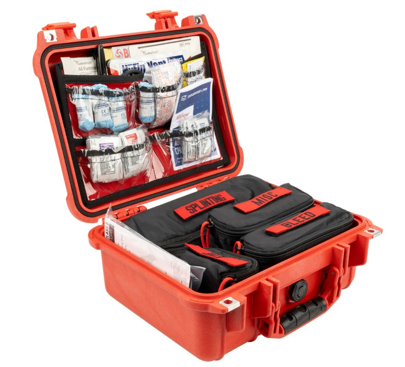 Packaged in a rigid, portable case with a modular system (rugged storage organizer + removable nylon pouches with clear treatment labels), this kit ensures fast access, organized response, and reliable durability at the patient’s side.