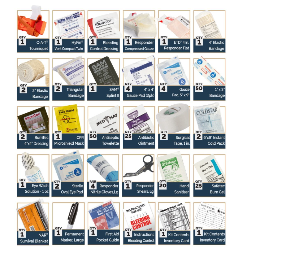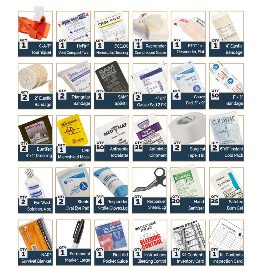 The TFAK (Trauma & First Aid Kit) – Class A is a workplace-ready kit designed to exceed ANSI/ISEA Z308.1-2021 Class A standards and OSHA requirements. Unlike basic first aid kits, Class A kits have advanced bleeding control tools, giving you the ability to respond to both everyday injuries and life-threatening emergencies.